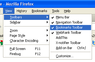 1) Pertama buka Mozilla Firefox milik sobat,lalu klik menu View – Toolbars – lalu beri tanda centang pada menu Bookmarks Toolbar.